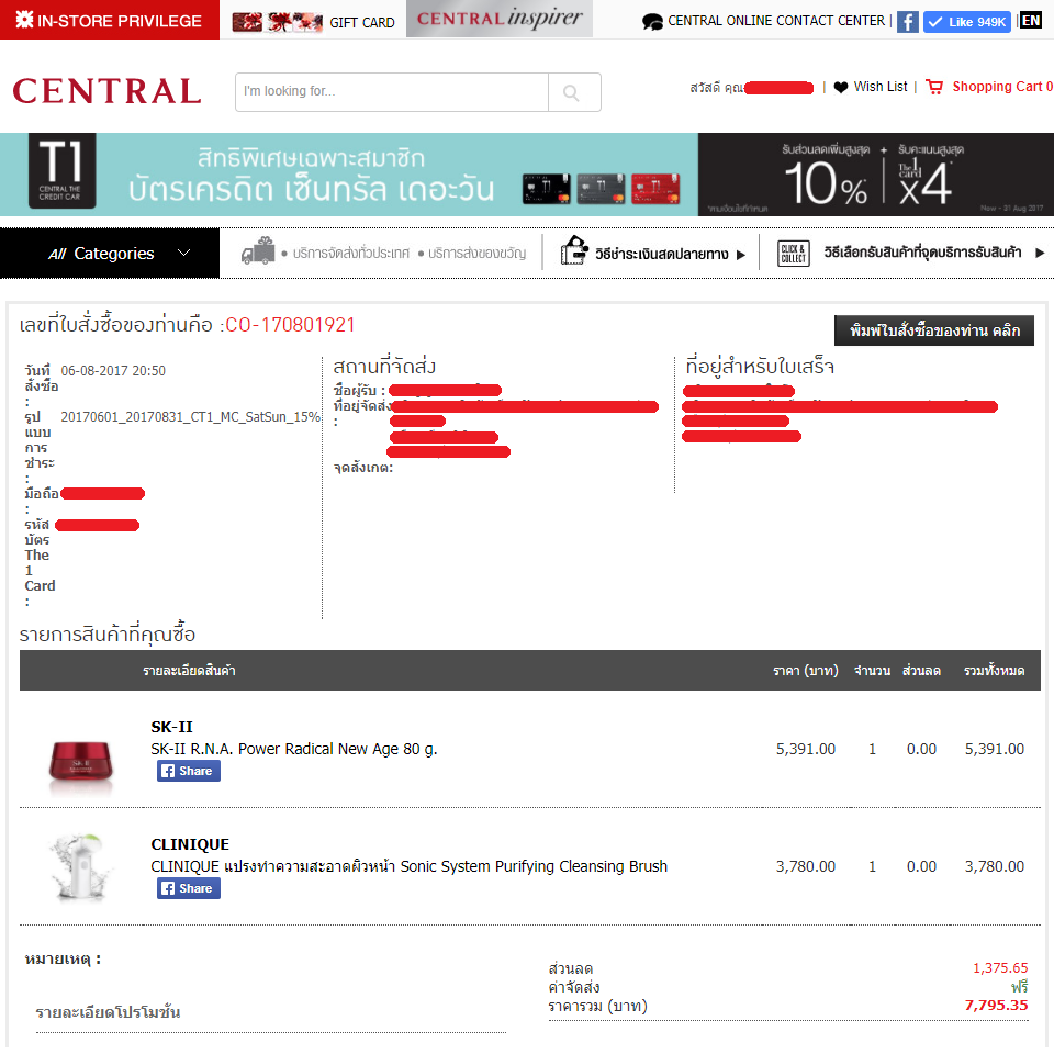 ได้สั่งซื้อสินค้าจากเซ็นทรั่ลออนไลน์ 2 รายการเมื่อวันที่ 6 สิงหา 2560 และก็ได้ชำระเงินทันที