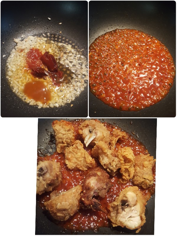 ***ของเราใช้ไก่ส่วนน่องทอด แต่เอามาสับ2 ท่อน อุ่นในหม้อไร้น้ำมันก่อนนำมาคลุกซอสค่ะ