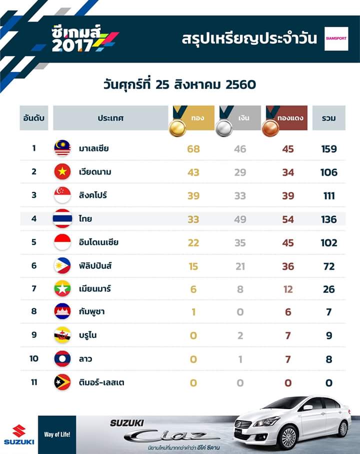 ปิดฉากลงไปอย่างเป็นทางการแล้วครับสำหรับซีเกมส์ครั้งที่ 28 ที่สิงคโปร์เป็นเจ้าภาพ ครั้งนี้นักกีฬาไทยทำผลงานได้ดีเยี่ยม ได้เหรียญทองถือว่าเป็นไปตามเป้าที่วางไว้และครองความเป็นเจ้าเหรียญทองได้อีกหนึ่งสมั
