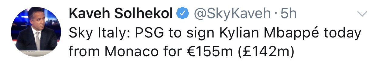 [Sky Italy ] PSG to sign Kylian Mbappé today from Monaco for €155m (£142m)