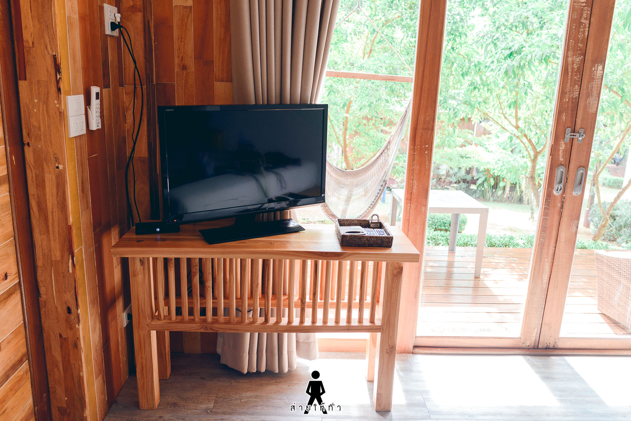 บริเวณด้านหน้าห้องพักของเรา มีทั้งโซฟาไว้นั่งชิล มีทั้งเปลไว้นอนเล่นด้วย