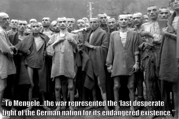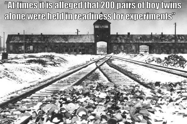 "ฉันคิดว่าฉันตายไปแล้วและกำลังมีชีวิตอยู่ในนรก" ผู้ช่วยชาวยิวคนหนึ่งเล่าให้ฟัง ความหลงใหลที่ใหญ่สุดของเขาในอีกไม่ไกลคือ ทำกับฝาแฝด !!! เขาเชื่อว่า นี่คือวิธีที่ดีที่สุดที่จะมี "การควบคุมได้" และมีการทดสอบเพื่อเปรียบเทียบผลของการทดลองทั้งหลายของเขา อย่างไรก็ตามสิ่งสำคัญคือถ้าคนหนึ่งตาย อีกคนหนึ่งก็จะถูกฆ่าตายไปด้วย ฝาแฝดทั้งหลายอาศัยอยู่หน่วย 14 ของค่าย F ซึ่งมีชื่อเล่นว่า "สวนสัตว์"