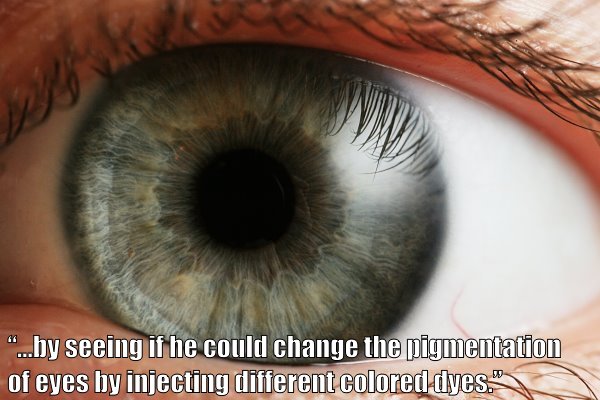 ก่อนหน้านี้เม็งเกเล่ได้เริ่มต้นทดลองเรื่องประหลาดพิสดารมาแล้ว ในความพยายามของเขาที่จะ "ทำคนเยอรมันให้สมบูรณ์แบบ" โดยการดูว่าเขาจะสามารถเปลี่ยนสีของดวงตาได้หรือไม่ โดยการฉีดสารพัดสีที่แตกต่างกันย้อมเข้าไป พอทำเสร็จครั้งหนึ่งแล้ว เขาก็จะควักดวงตาทั้งสองข้างออกมา และแขวนมันไว้บนผนัง "ตรึงไว้เหมือนกับตรึงผีเสื้อไว้ดูเล่น"