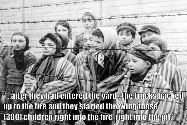 บางครั้ง เม็งเกเล่ไปจัดการสังหารหมู่ด้วยวิธีการจริง ไม่มีทฤษฎีอะไรทั้งนั้น และไม่มีประโยชน์ทางวิชาการอะไรที่จะได้รับ เขาบังคับให้เด็กฝาแฝดสองคู่มีเพศสัมพันธ์กัน ซึ่งมีคำพูดว่า "พวกเขาเป็นนักโทษ และห้ามพูดเรื่องนี้" เคสที่เลวร้ายที่สุด (อย่างน้อยก็มีการบันทึกไว้), เม็งเกล เอารถบรรทุก 10 คันรถขนเด็กๆ จำนวน 300 คน และให้ขับหมุนวนรอบรถพ่นไฟคันใหญ่ รถบรรทุกถูกทิ้งแล้วเด็ก 300 คนถูกเผาทั้งเป็น เจ้าหน้าที่จะเดินไปรอบ ๆ คอยเอาไม้ผลักดันเด็กที่หลบหนีให้กลับเข้าไป ทั้งหมดนั้นมีอายุต่ำกว่า 5 ปี