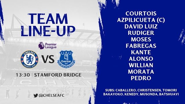 Courtois; Azpilicueta (c), David Luiz, Rudiger; Moses, Kante, Fabregas, Alonso; Willian, Morata, Pedro.