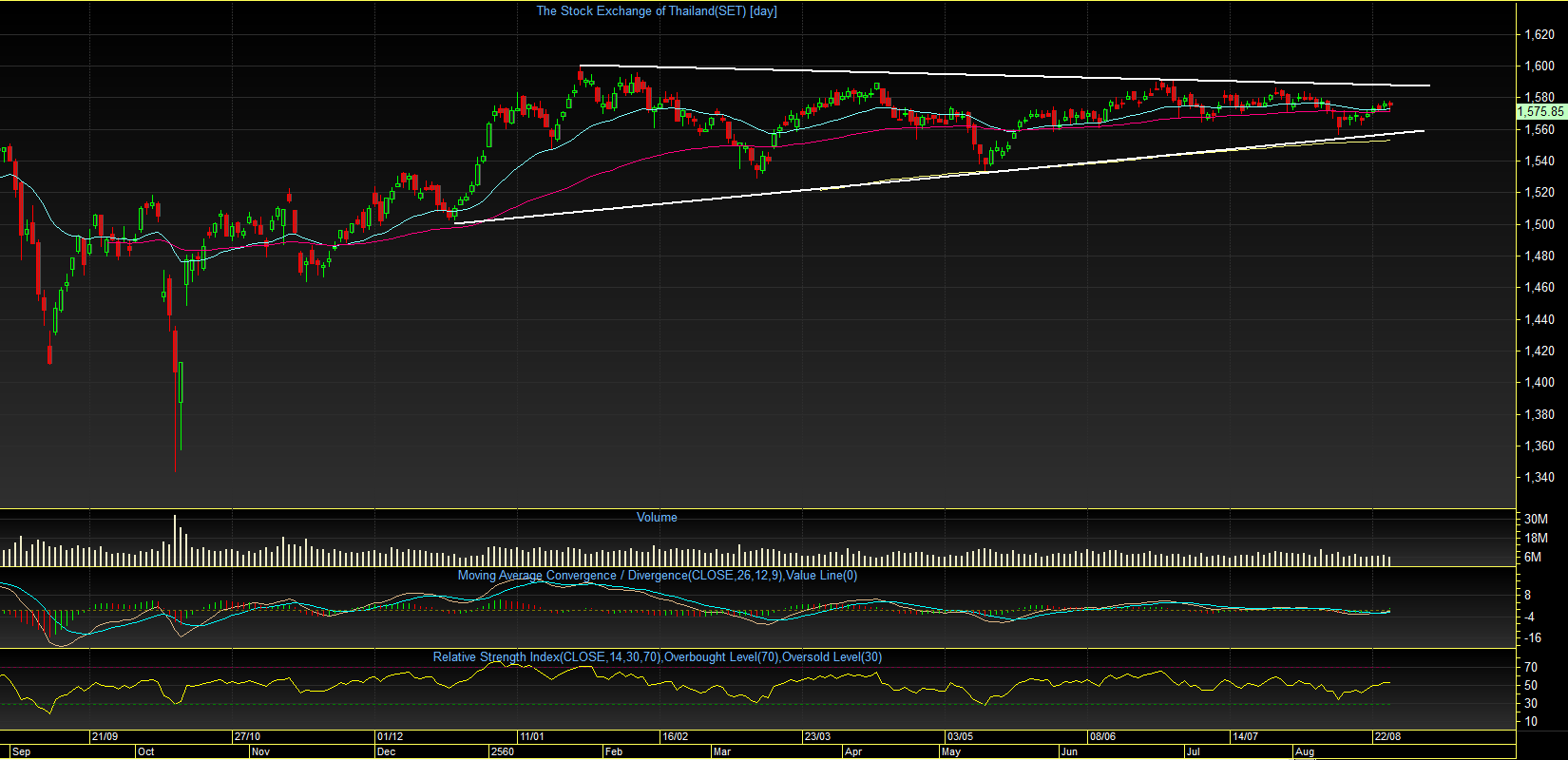 ตลอดการซื้อขาย เมื่อวานศุกร์ที่ผ่านมา ดัชนี SET index เคลื่อนไหวแกว่งตัวในกรอบแคบๆ (1572-1577จุด) เนื่องจากไม่มีปัจจัยใหม่ๆ