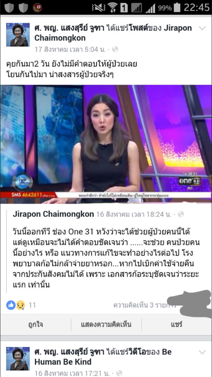 เนื่ิองจากเมื่อสักครู่ได้ฟังศาสตราจารย์แพทย์หญิงแสงสุรีย์ จูฑา พูดผ่านช่อง 3 ว่าควรแก้ไขระเบียบให้มีการเบิกจ่ายยารักษามะเร็งเม็ดเลือดขาวระยะที่ 3 ให้ผู้ป่วยประกันสังคมได้