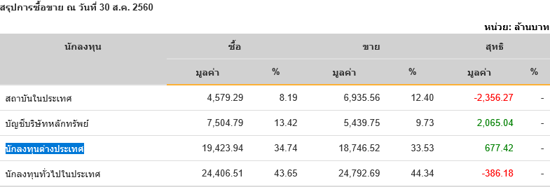 Sinthorn Summary 30/8/2560 : ต่างชาติซื้อสุทธิ 677.42 ลบ.