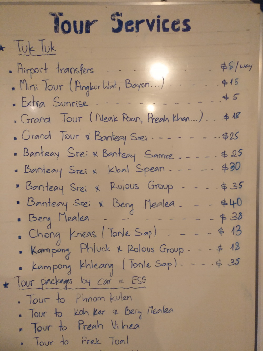 อันนี้เป็นราคาของhostelแห่งหนึ่งในเสียมเรียบซึ่งแน่นอนรวมค่าคอมมิชชั่นไว้แล้ว แต่ราคาเท่าที่สังเกตก็เป็นราคากลางๆถ้าไปเรียกเองก็ราคาไม่ต่างกันมากเท่าไร ให้ใช้เป็นบรรทัดฐานได้ว่าไม่ควรจ้างเกินราคานี้ ราคาจะขึ้นอยู่กับสถานที่ไป ไม่ใช่เหมาทั้งวันนะครับตรงนี้อย่าเข้าใจผิด