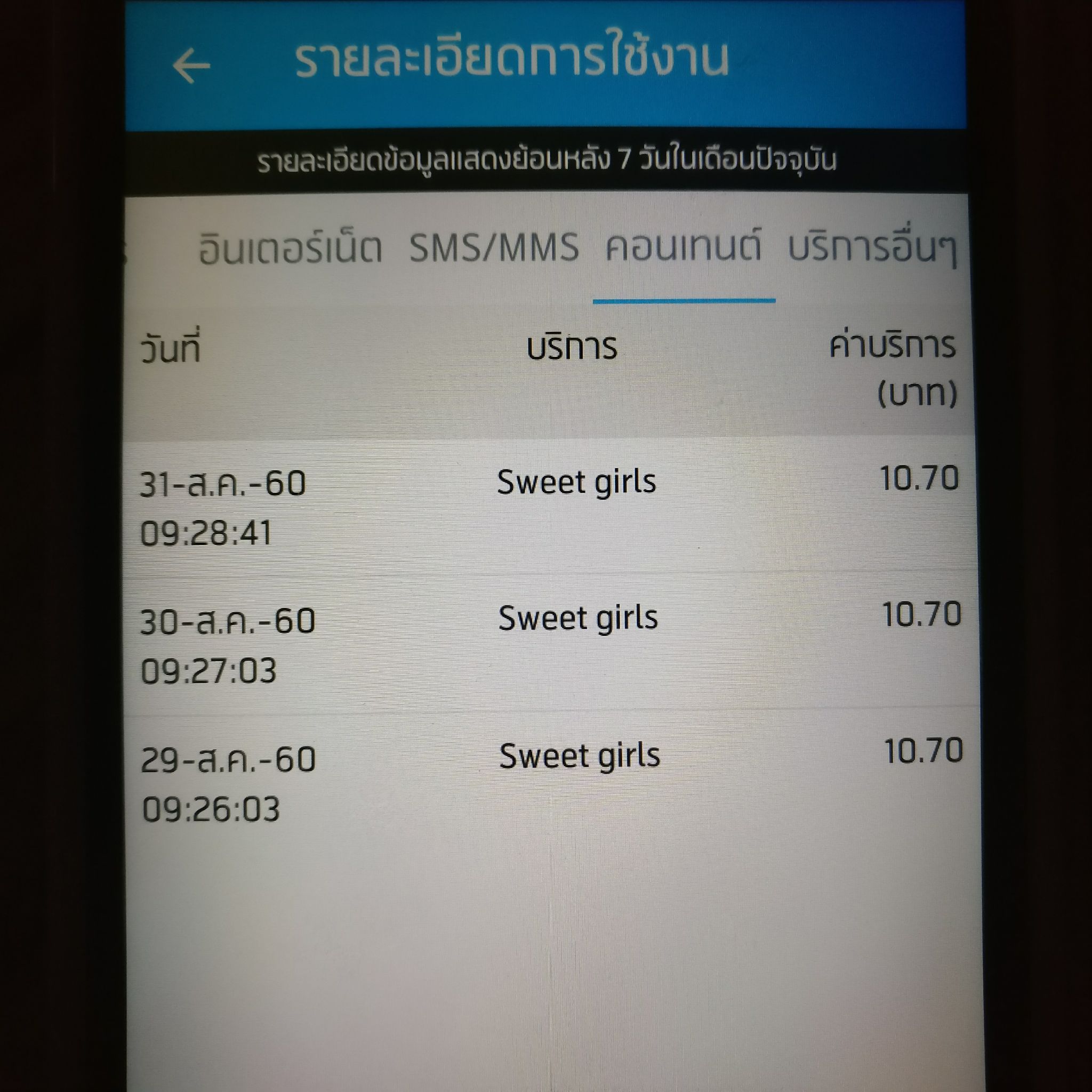 เบอร์คุณแม่ผมโดนหักเงินทุกวันๆ กับริการเสริมที่มันกินเงินเนี้ยครับ คุณแม่ผมอายุ 60 กว่า ต้องมานั่งเช็คยอดเงินทุกวันเช้าเย็น ผวากลัวจะโดนกินเงิน ทั้งๆ ที่เราเคยคุยกันแล้ว และคุณน้องฟ้ารับปากกับผมว่าจะบล็อคบริการเสริมทั้งหมดให้ ไปดูในข้อความหลังไมค์ที่คุยกันได้ครับ แล้วนี่อะไรมาอีกแล้ว