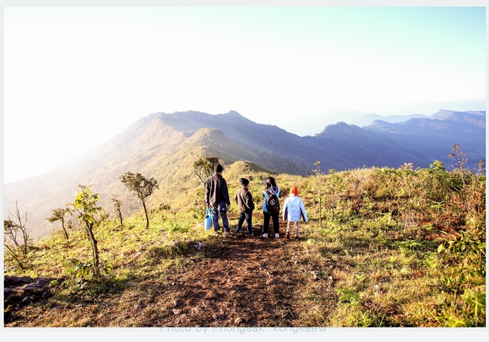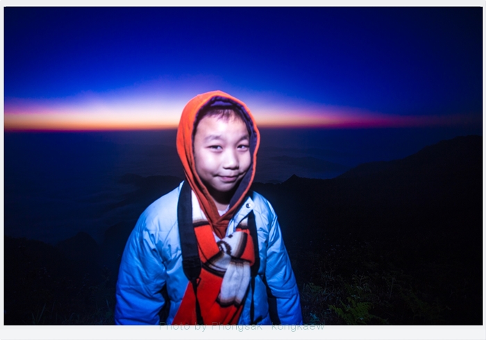 เมื่อถึงจุดจอดรถ เราต้องเดินขึ้นอีกนิด ณ เวลานั้น ตี 5 นิดๆ รีบเลยก่อนฟ้าสาง เรามีเด็ก ติดตาม 1 คน เรารีบเดินขึ้นโดยฉายไฟเดินขึ้นไป