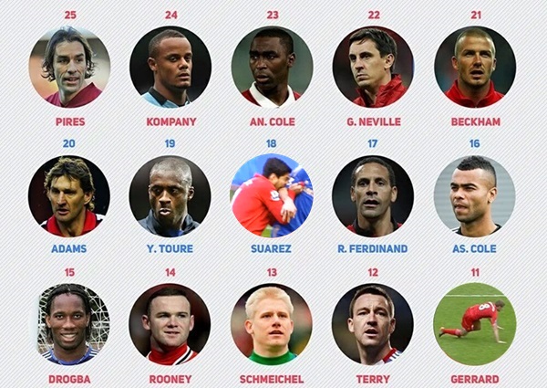 จะเห็นได้ว่า 15 อันดับหลังนั้นมีนักเตะจากทีมที่ไม่เคยคว้าแชมป์พรีเมียร์ลีกเพียงแค่ 2 คนเท่านั้น... นั่นหมายถึงการจัดอันดับน่าจะอ้างอิงความสำเร็จอันเป็นรูปธรรมมากกว่าคำอวย เอาเป็นว่าไม่มีอะไรให้น่าจดจำ งั้นมาดูกันต่อดีกว่าคนับ