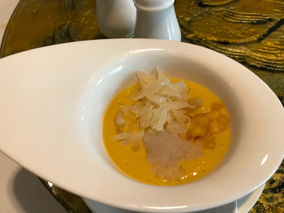 สาคูมะม่วง - หอม ไม่หวานมาก สาคูเม็ดเล็ก มะม่วงสุกหั่นเต๋า ราดด้วยซอสมะม่วง โรยหน้าด้วยส้มโอ แนะนำให้ลอง