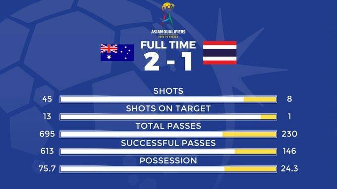ถ้าดูจากสถิติก็คงมองออกว่าเราสู้ไม่ได้ด้วยประการทั้งปวง เพียงแต่เราโชคดีตรงที่ออสเตรเลียมีลูกจ่ายสะเปะสะปะเยอะมากๆ ยิงชนเสาชนคานกัน4-5 ครั้ง แถมผู้เล่นออส ต่างคนต่างยิง ระบบอะไรไม่สนทั้งนั้น แถมเมื่อวานยิงกันไม่ค่อยดีด้วย ทำให้เราแพ้แค่ 2-1