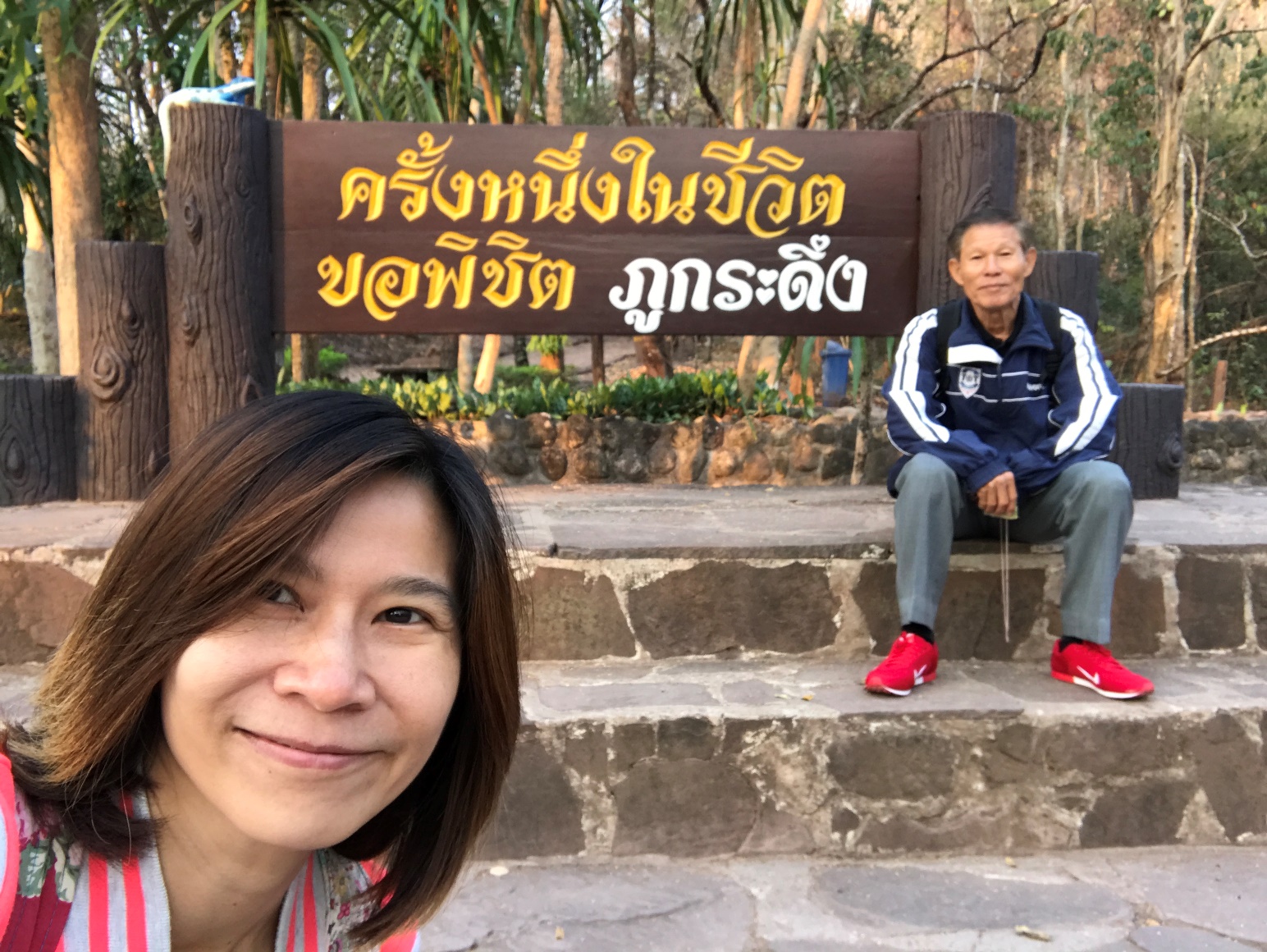 ก่อนอื่นต้องขอบอกก่อนเลยว่า ทริปนี้เป็นไฟท์บังคับ เพราะหนุ่มใหญ่คนนี้บอกว่า ถ้าคราวนี้ไม่ไปอีก (เลื่อนเค้ามา 2 ปี) เค้าจะไปคนดียวแล้วนะ อ้าวเฮ้ย จะปล่อยให้ไปคนเดียวได้ไง อายุเค้าก็ไม่ใช่น้อยๆ เกิดเป็นลมเป็นแล้งขึ้นมา แย่เลย หนุ่มใหญ่คนที่ว่าคือพ่อเราเองค่ะ การขึ้นภูกระดึงครั้งนี้ไม่ใช่ครั้งแรกของเค้าหรอกค่ะ เค้าขึ้นมาหลายครั้งแล้ว แต่ที่เค้าอยากขึ้นอีก เพราะเค้าบอกว่า เค้าแก่แล้วไม่รู้ว่าถ้าเลื่อนออกไปอีกเค้าจะขึ้นไหวหรือเปล่า ตอนนี้เค้ายังพอไหว เค้าเลยอยากจะขึ้นอีกครั้ง (พ่ออายุ 72 ปี) หลังจากที่เค้ายื่นคำขาดมาเราก็จัดแจงดูตารางแล้วก็ลางานอย่างเร่งด่วน  สรุปคือ เราออกเดินทางวันที่ 2 มีนาคม 2560 (งานดอง) และเดินทางกลับวันที่ 6 มีนาคม 2560 ใช้เวลาบนภู 3 วัน 2 คืน เพื่อที่พ่อจะได้ไม่ต้องเหนื่อยมากนัก