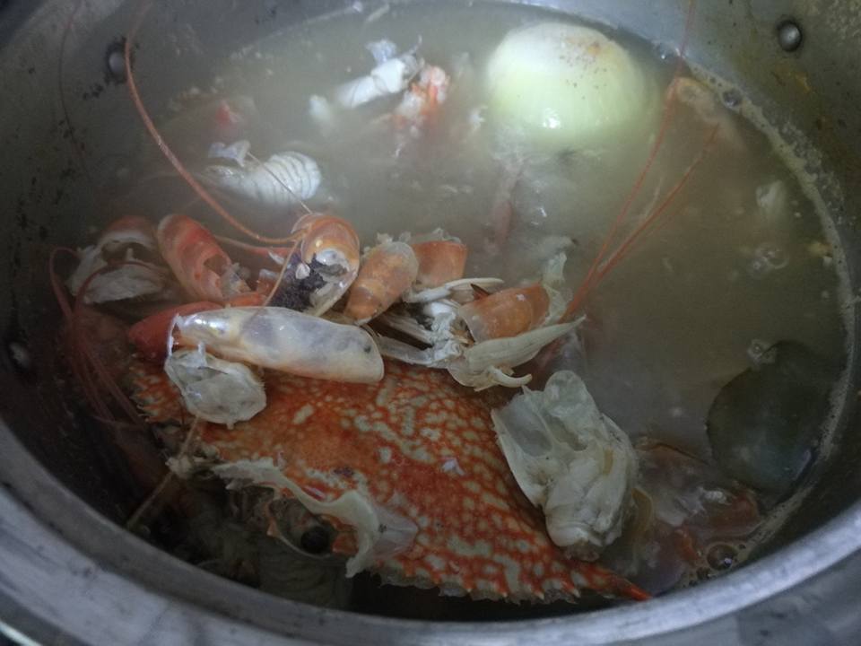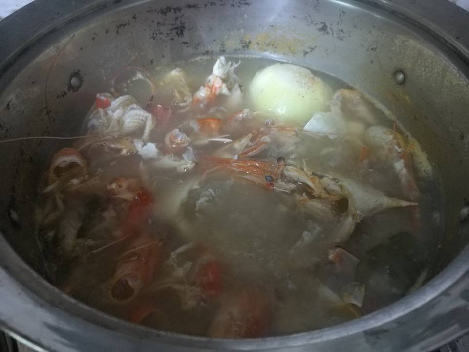 พอน้ำเดือดค่อยใส่เปลือกปูกุ้งทั้งหลายลงไป แล้วหรี่ไฟ ตั้งไว้ ปิดฝา 20 นาที