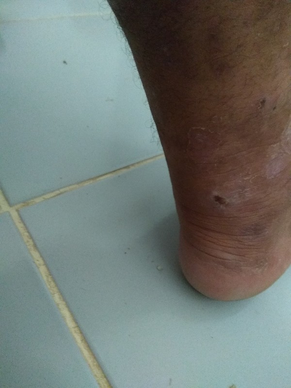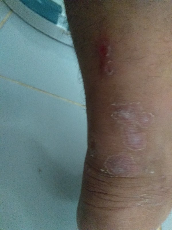 เป็นแผลพุพองมา2-3ปีแล้วครับขึ้นตามขา ตอนนี้มีใต้เท้าขึ้นเป็นหนองเดินแล้วปวดๆแสบๆ แต่ตรงขามีอาการคันและเกาหนัก บริเวณสีขาวคือยาที่หมอให้ทาครับ ใครเคยเป็นแนะนำหน่อยครับว่าควรกินอะไร