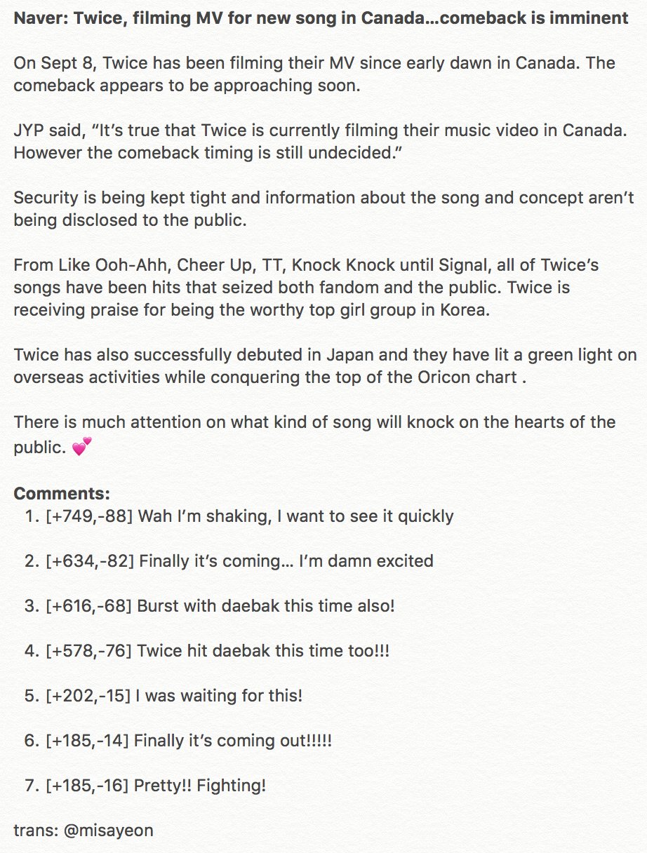 ในวันที่ 8 กันยายน 2017 TWICE ได้กำลังถ่ายทำ MV ของพวกเธอตั้งแต่เช้าตรู่ที่แคนาดา แสดงว่าการคัมแบคของพวกกเธอใกล้เข้ามาแล้วสินะเนี้ยะ