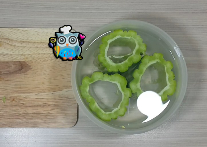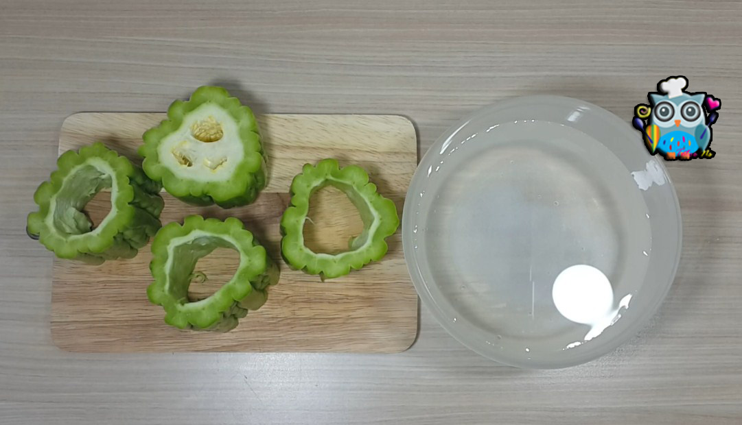 1.ล้างมะระทั้งลูกหั่นเป็นท่อนๆ ใช้ช้อนตักควักไส้อออกทิ้งแช่ในน้ำเปล่าผสมเกลือป่น 1 ช้อนโต๊ะ