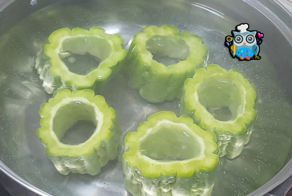 2.ตั้งน้ำให้ร้อนใส่เกลือป่น 1 ช้อนโต๊ะ พอเดือดใส่มะระที่แช่น้ำเกลือลงไปต้ม 4 นาทีเพื่อลดความขม ครบเวลาตักมะระไปแช่น้ำเย็นทันที