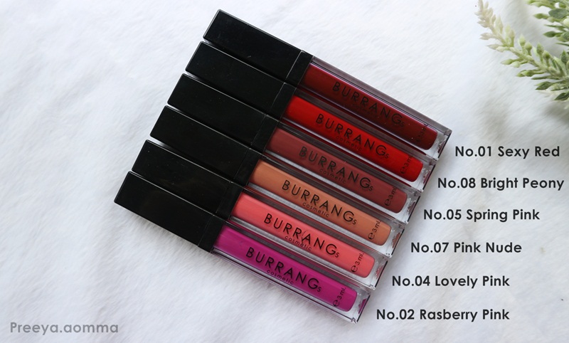 BURRANGs Cosmetic รุ่น Extra Liquid Matte Lips Color นี้มีสีให้เลือกมากถึง 8 เฉดสี ด้วยกันค่ะ