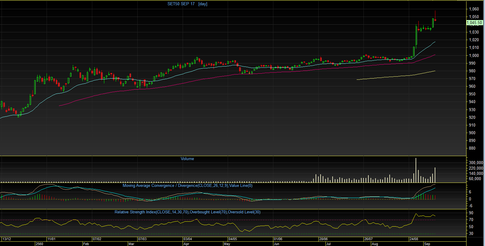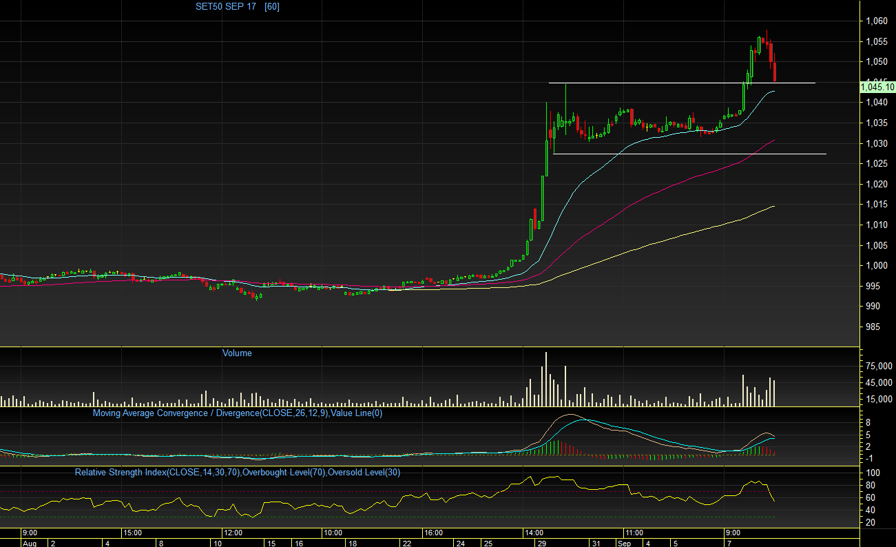 TF60 : เมื่อวานศุกร์ที่ผ่านมา ดัชนียังคงพุ่งทะยานขึ้นไปอย่างต่อเนื่อง จนมาถึงระดับ 1056 จุด (High ในวัน) ก็เริ่มเผชิญกับแรงเทขาย