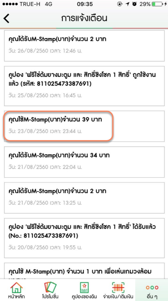 ก็เลยไปตรวจสอบ Notification ในแอพ ปรากฏว่า มียอดสแตมป์ถูกใช้งานไป 39 บาท ในวันที่ 23/08/2560 เวลา 23:44 น.