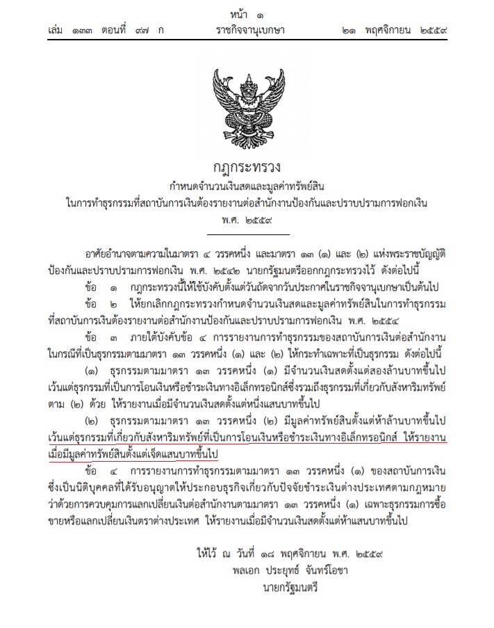 - ในการซื้อขายหุ้น ถ้ามีการโอนเงินหรือชำระเงินทางอิเล็กทรอนิกส์ เช่น ไอแบ้งกิ้งหรือแอปของธนาคาร ถ้าโอนเกิน 7 แสนบาท ทางธนาคารจะต้องรายงานไปยัง ปปง. ทุกธุรกรรม    แต่ถ้าไปโอนที่หน้าเคาน์เตอร์ธนาคารจะได้ถึง 5 ล้านบาท