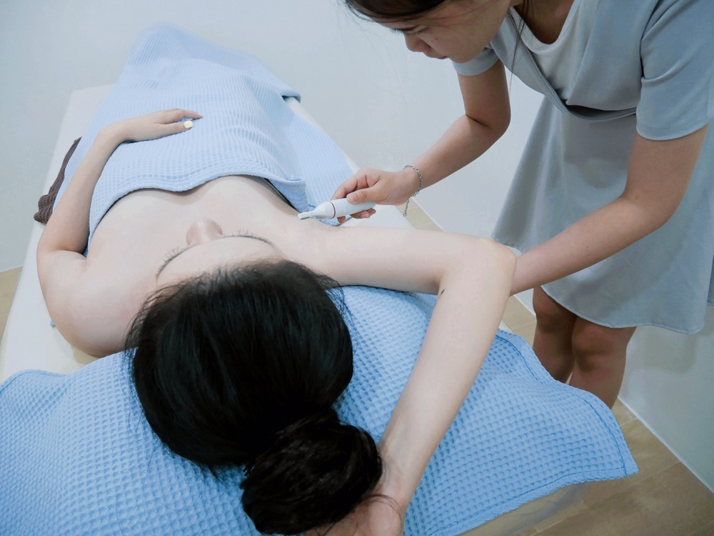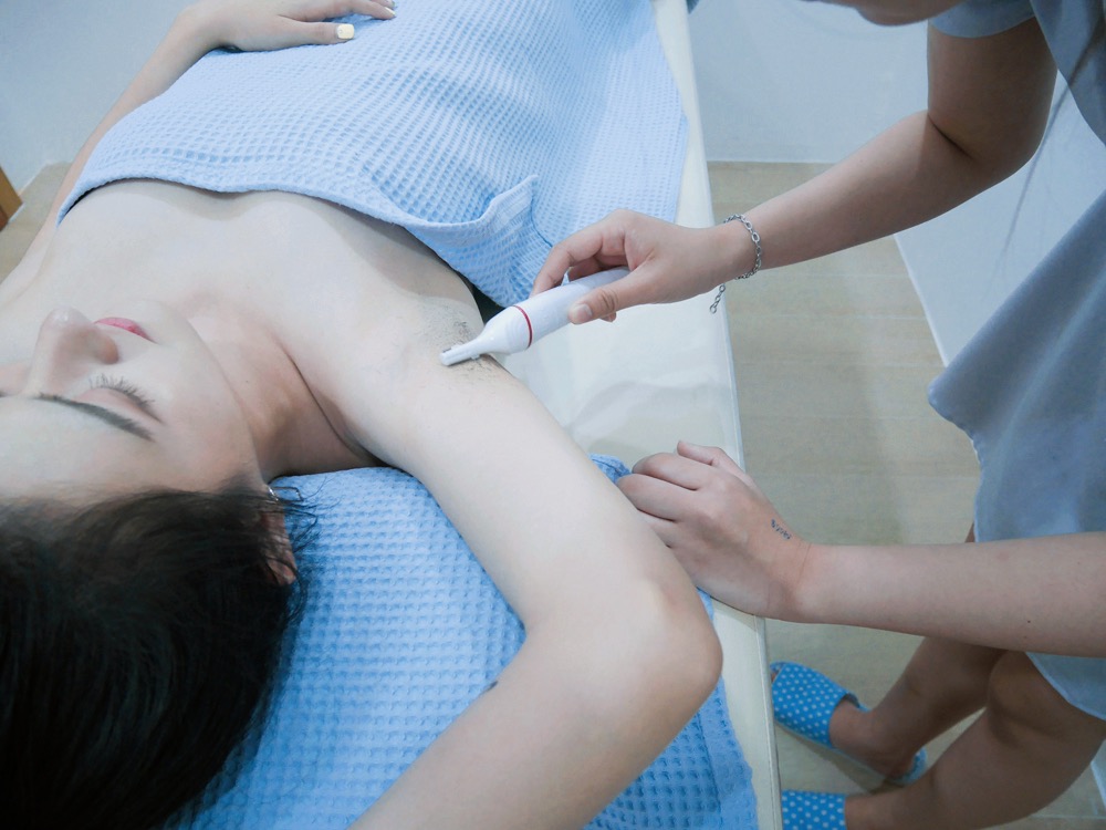 ขอเป็นการอธิบายสั้นๆ นะคะ คือทางร้านก็จะใช้ตัวเครื่องมาทำการนวดวนๆ ตรงจุดที่เรากำจัดขน