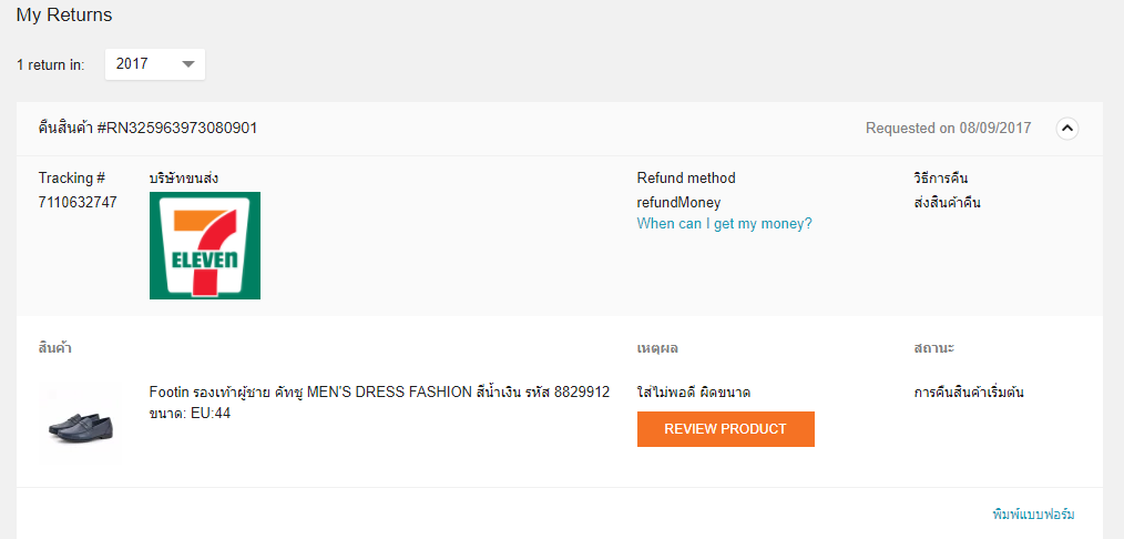 ผมได้ทำการซื้ิอรองเท้าจาก lazada มาได้รับของเมื่อวันศุกร์ที่ผ่านมา พอลองแล้วใส่ไม่ได้ เลยทำเอกสารขอคืนเงินผ่าน 7-11