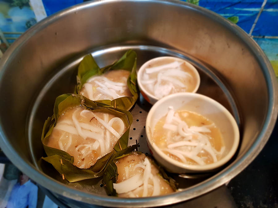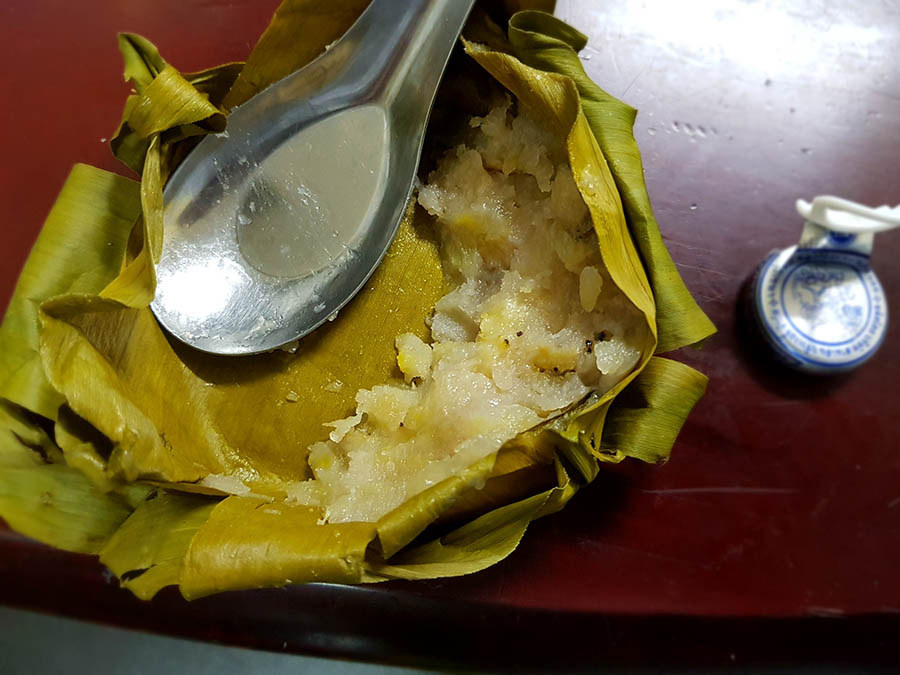 มินิ : ที่มันใส่ใบตองมีมะพร้าวเป็นเส้นโรยด้านบน