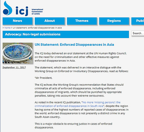 เมื่อวันที่ 11 ก.ย.ที่ผ่านมา รายงานข่าวแจ้งว่า คณะกรรมการนักนิติศาสตร์สากล (International Commission of Jurists หรือ ICJ) ได้กล่าวแถลงด้วยวาจาต่อคณะมนตรีสิทธิมนุษยชนแห่งสหประชาชาติเกี่ยวกับความจำเป็นในการบัญญัติให้การบังคับสูญหายเป็นความผิดตามกฎหมายอาญาในภูมิภาคเอเชีย รวมถึงในประเทศไทย โดยได้กล่าวถึงความล้มเหลวของเจ้าหน้าที่ในการสืบสวนสอบสวนอย่างมีประสิทธิภาพในกรณีที่มีการกล่าวหาว่ามีการบังคับให้บุคคลสูญหายในกรณีของ สมชาย นีละไพจิตร และ พอละจี “บิลลี่” รักจงเจริญ เนื่องจากการปราศจากกฎหมายภายในประเทศที่กำหนดให้การบังคับให้บุคคลสูญหายเป็นความผิดทางอาญา