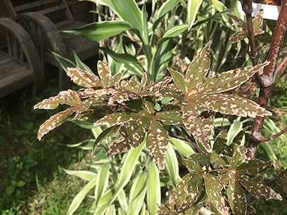 ใบของต้นเมเปิ้ลญี่ปุ่นแห้งกรอบ แล้วค่อยๆร่วงค่ะ แถมใบยังโดนแมลงกันจนแหว่งไปหมดแล้ว
