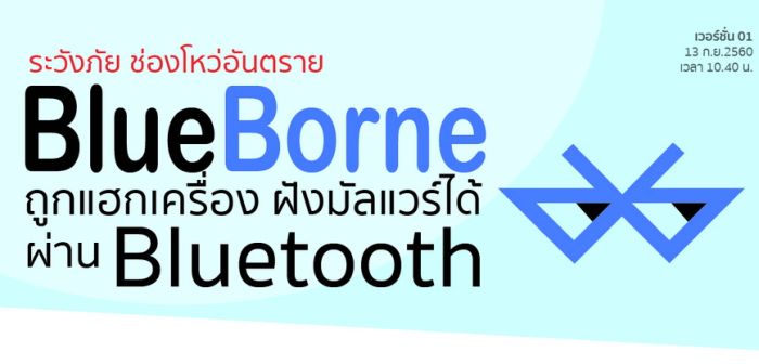 ThaiCERT (ไทยเซิร์ต) ออกประกาศแจ้งเตือนภัยช่องโหว่ชื่อ BlueBorne (บลูบอร์น) ตามรายงานจากบริษัทด้านความมั่นคงปลอดภัย Armis (อาร์มิส) เมื่อวันที่ 12 กันยายนที่ผ่านมา BlueBorne เป็นข้อผิดพลาดที่ส่งผลให้เกิดโอกาสที่จะถูกขโมยข้อมูล หรือถูกติดตั้งมัลแวร์ที่เปิดใช้งานบลูทูธ (Bluetooth) และอยู่ในรัศมีประมาณ 10 เมตร โดยที่ตัวอุปกรณ์ไม่จำเป็นต้องจับคู่ (Pair) กับอุปกรณ์ที่ใช้โจมตี รวมถึงไม่จำเป็นต้องเปิดโหมดค้นหาอุปกรณ์ (Discovery mode) แต่อย่างใด