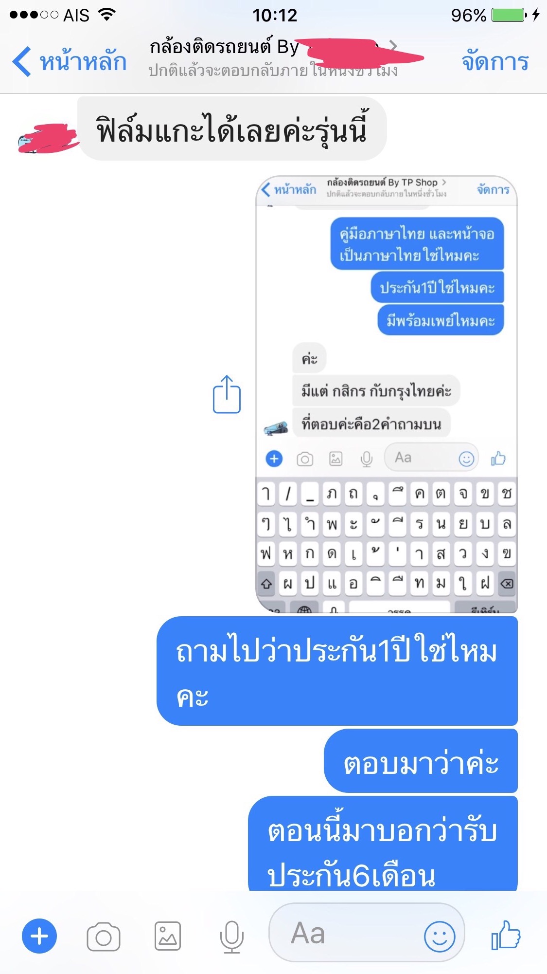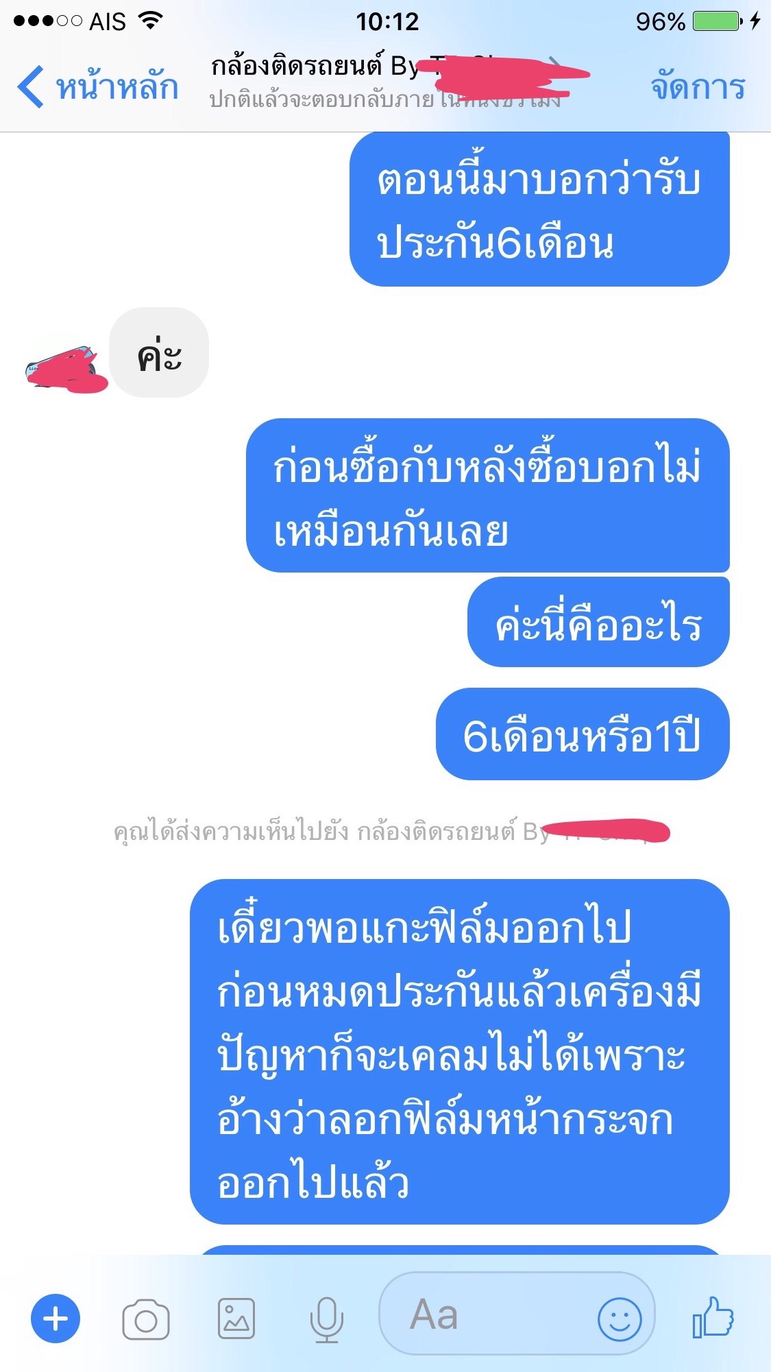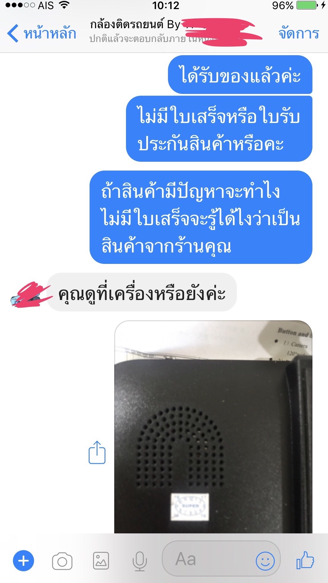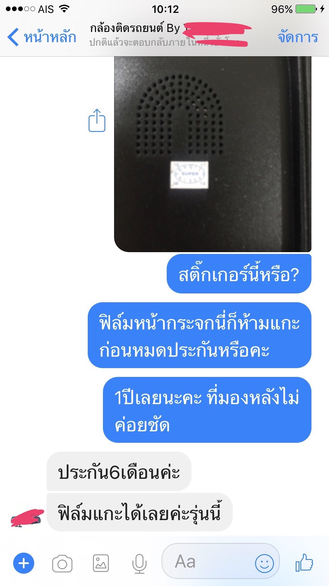 สวัสดีค่ะ นี่คือข้อความแชทของเพื่อนเรากับร้านค้าขายกล้องติดรถยนต์แห่งหนึ่ง เมื่อ12/9/60 เพื่อนได้หากล้องติดรถยนต์ตามในเพจในfb เพื่อทดแทนตัวเก่าทีเสีย สอบถามอยู่2ร้าน แต่ตกลงซื้อร้านนี้เพราะมีรับประกัน1ปี