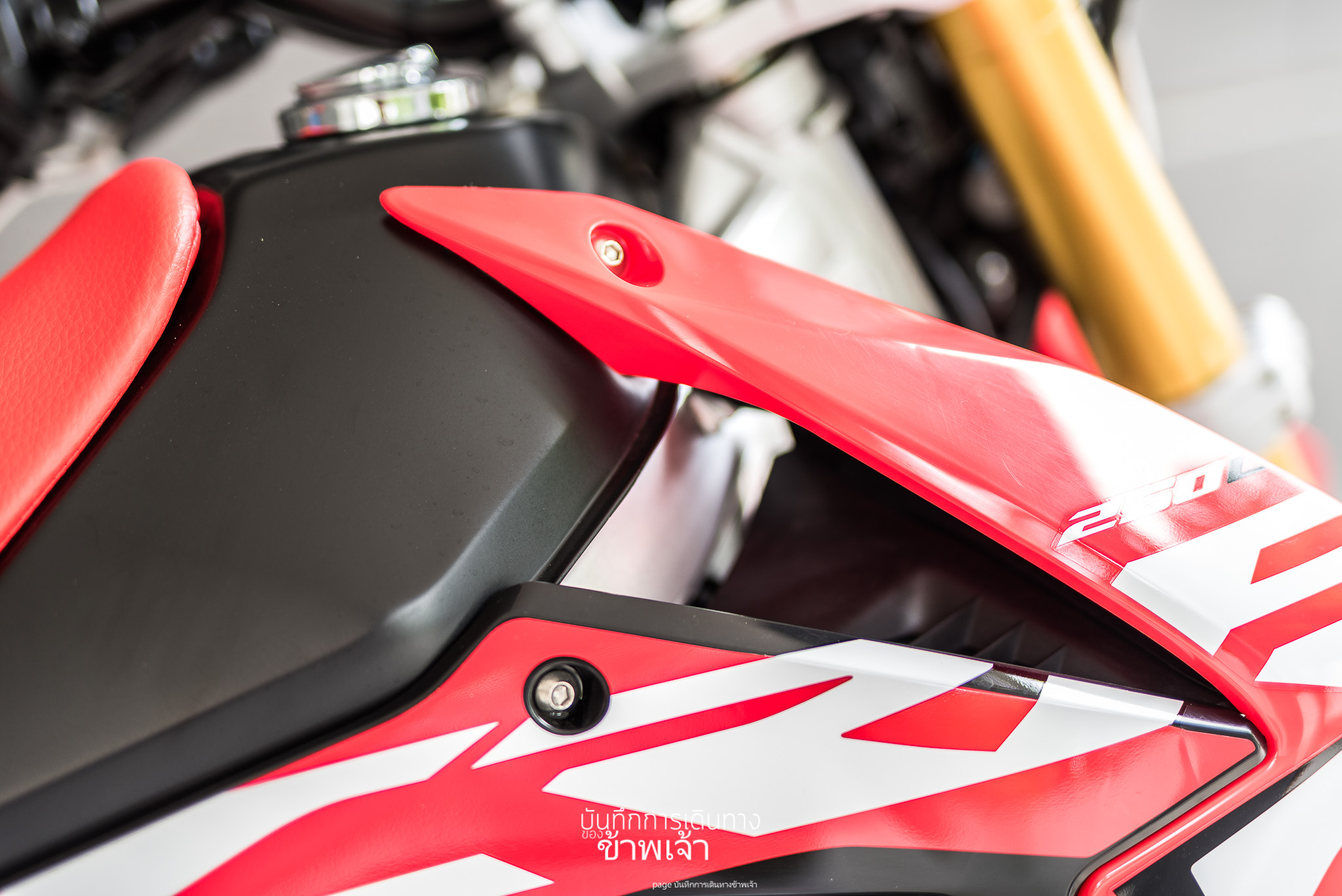 ถ่ายเจาะช่วงไฟหน้า สวยดี งานดิบดีตอนแรกก็กังวลว่ามันจะเหมาะไหม เพราะคิดว่ารถมันเล็ก ติดปี๊บข้าง 37 หรือ 39 ลิตรแล้วอาจจะดูไม่สมส่วน แต่ตอนนี้พบว่ารถมันไม่ได้เล็กเลย เพราะฉะนั้น สมส่วนแน่ แค่ว่าเราจะคุมรถยากขึ้นอีกหน่อย ก็ไปควบคุมให้ได้แล้วกัน