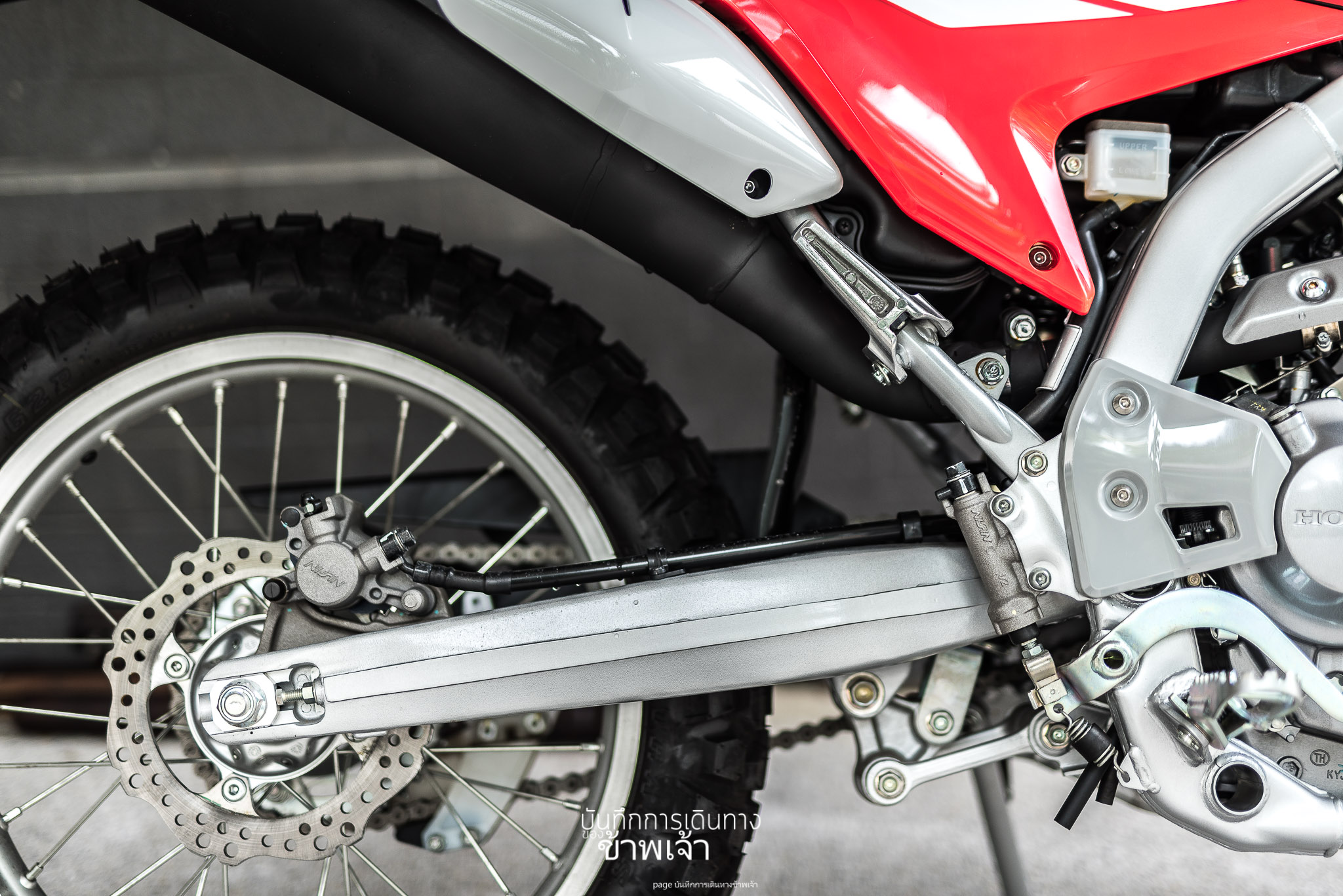 ถ่ายเจาะมาช่วงท้ายรถค่อนไปทางล้อหลัง ให้เห็นสวิงอาร์มชัด ๆมาว่าถึงความแรง ก็รู้สึกว่าแรงนิดนึง คือผมยังไม่ได้บิดหนัก ๆ มือด้วย แต่ตอนแรกคิดว่ามันจะกระชากกว่านี้อีกซักหน่อย ความเร็วปลายยังไม่รู้ แต่รู้สึกว่ามันก็ไม่ได้เร็วมาก นั้นก็ไม่แปลก เพราะรถแนวนี้ ไม่ได้ออกแบบให้ใช้ความเร็วสูงมาก ๆ อยู่แล้ว แม้ว่ากลุ่ม CRF 250L จะบอกว่ามันวิ่งได้ถึง 140 ได้ไม่ยาก ซึ่งผมก็คงวิ่งไม่ถึงง่าย ๆ เพราะไม่มั่นใจในยางวิบาก ล้อหนามแบบนี้เมื่อต้องารใช้ในทางเรียบ เพราะรู้สึกว่ามันดิ้นได้บ้างนะ นิดนึง นิดมาก ๆ ในบางจังหวะ แต่เป็นได้ว่ายางมันอาจจะยังใหม่อยู่ หรือก็อาจจะเพราะธรรมชาติของยางวิบาก ก็จะเป็นแบบนั้นอยู่แล้วด้วยละมั้ง เพราะดอกยางมันกว้าง ห่าง ลึก และเป็นเหมือนตุ่ม ๆ การจะดิ้นนิด ๆ คงไม่แปลก แต่ยางพวกนี้น่าจะดีมาก ๆ ในสภาพถนนที่มันไม่แน่น ไม่แข็งตัว