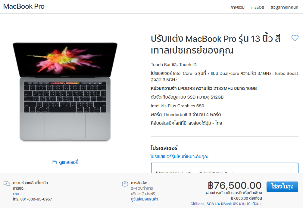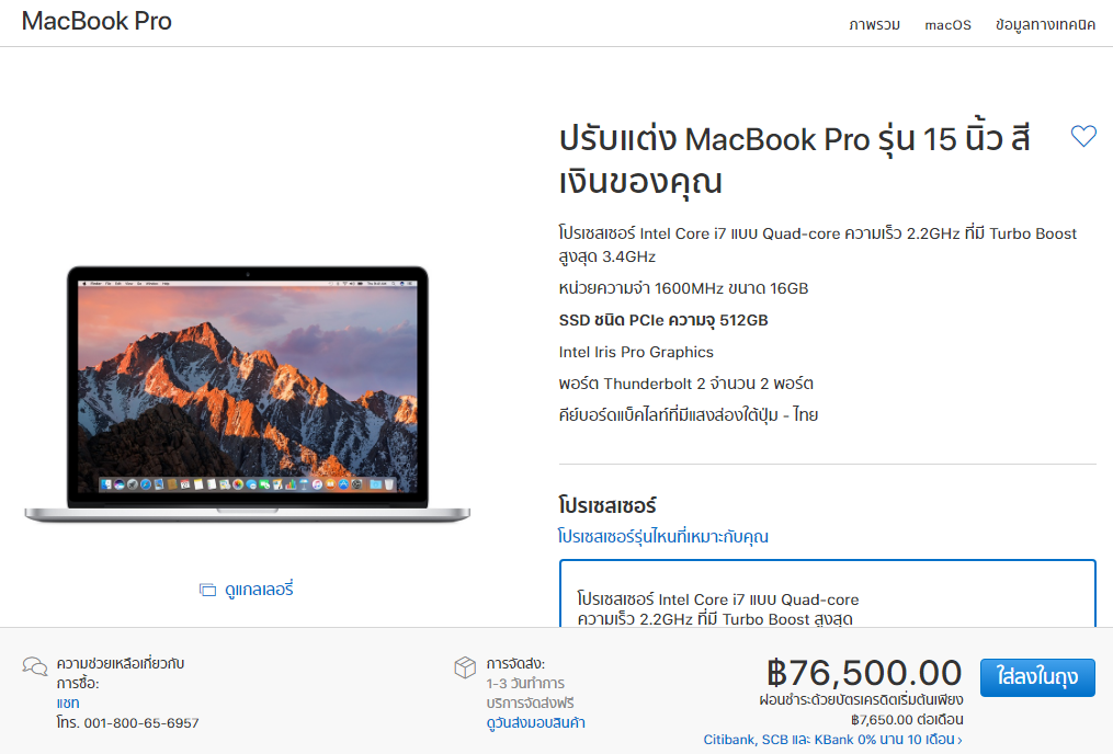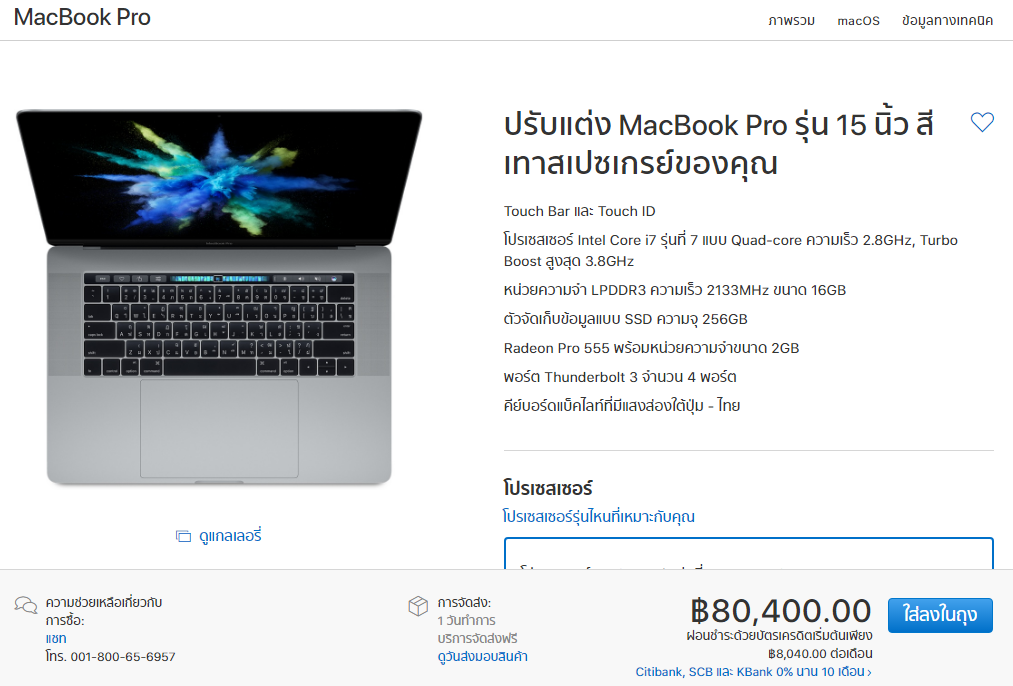 Macbook Pro 15" ตัวใหม่ -> ram16 ssd256 -> 80,400