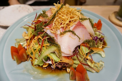 เปิดตัวจานแรกด้วย Zuru Salad สลัดที่มีส่วนผสมเยอะมากกก เท่าที่เคยทานสลัดมา นับๆดูแล้วน่าจะประมาณ 11 อย่างได้ค่ะ คือแค่ปลาดิบก็หลายชนิดแล้ว และยังชิ้นหนาๆใหญ่ๆ (สดมากอีกด้วย) ไหนจะผักสดกรอบที่หลากหลาย รวมไปถึงเจลลาตินนุ่มลิ้นรสแอ๊ปเปิ้ลที่แปลกใหม่มาก รวมอยู่ในสลัดจานนี้ด้วย ส่วนน้ำสลัดก็รสชาติดี ราดเข้าไปแล้วทุกอย่างให้ความรู้สึกลงตัวมาก ผู้ใหญ่หรือคนรักสุขภาพต้องโดนค่ะ