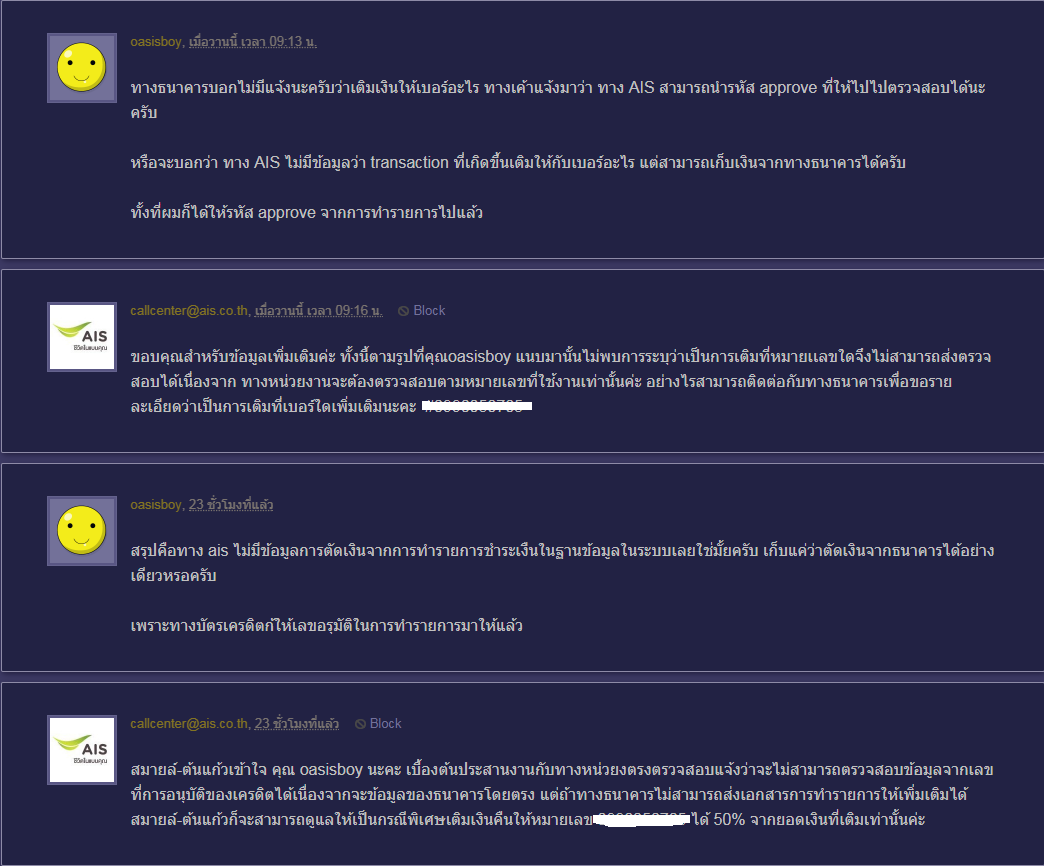 แต่ทาง AIS ก็บอกตรวจสอบไม่ได้ครับ ต้องมีหลักฐานทางธนาคาร ถ้า 2 ฝ่ายยังตรวจสอบไม่ได้ ผมจะตรวจสอบได้มั้ย