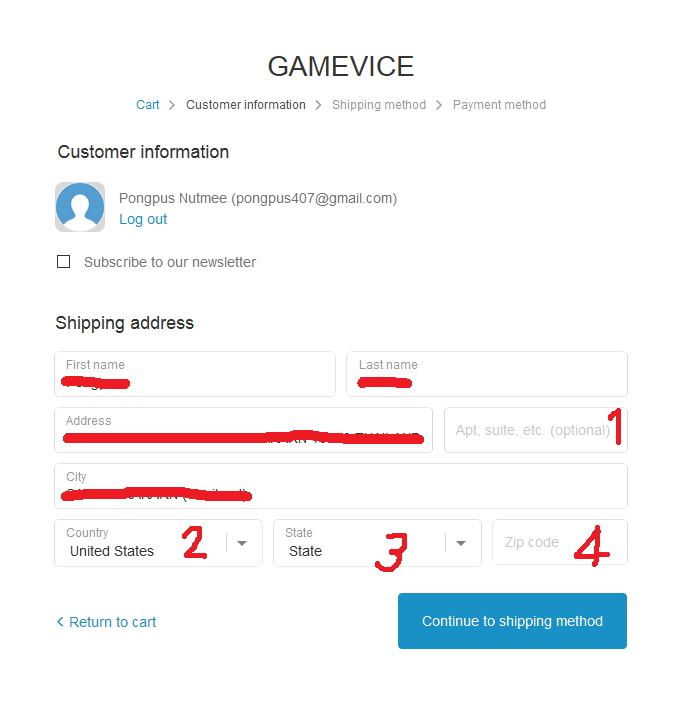 พอดีว่าจะสั่งของทางเนต ของเว็ปต่างประเทศ อ่าครับ แต่ไม่เข้าใจภาษา เลย พยายามหา ข้อมูลจากทาง google แล้ว ก็ยังคงเจอทางตันอยู่ รบกวนผู้รู้หน่อยนะครับ ว่าในแต่ละช่อง(1,2,3,4) จะต้องใสข้อมูลอะไร ลงไปบ้าง กลัวว่าสั้งไปแล้วของจะไปที่อื่น ยังไงขอความกรุณา จากทุกๆท่าน ด้วยนะครับ ขอบพระคุณเป็นอย่างยิ่ง
