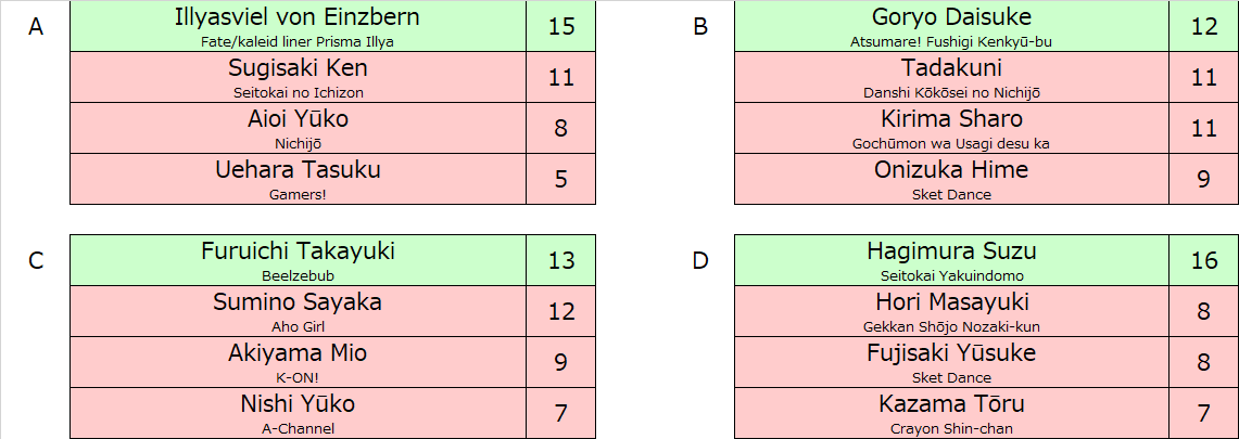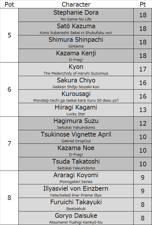 ซึ่งทำให้ได้ตัวละคร 16 ตัวผ่านเข้ามาในรอบแบ่งสาย เรียงตามลำดับคะแนนและแบ่งโถดังนี้
