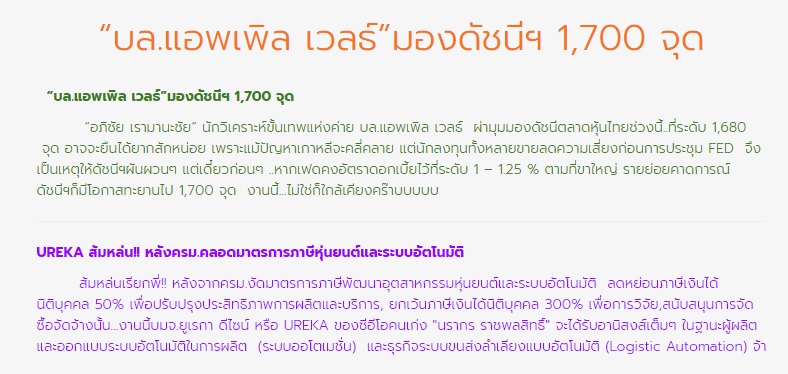 **บล.แอพเพิล เวลธ์ มองดัชนีฯ 1,700 จุด