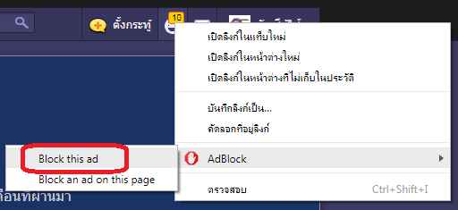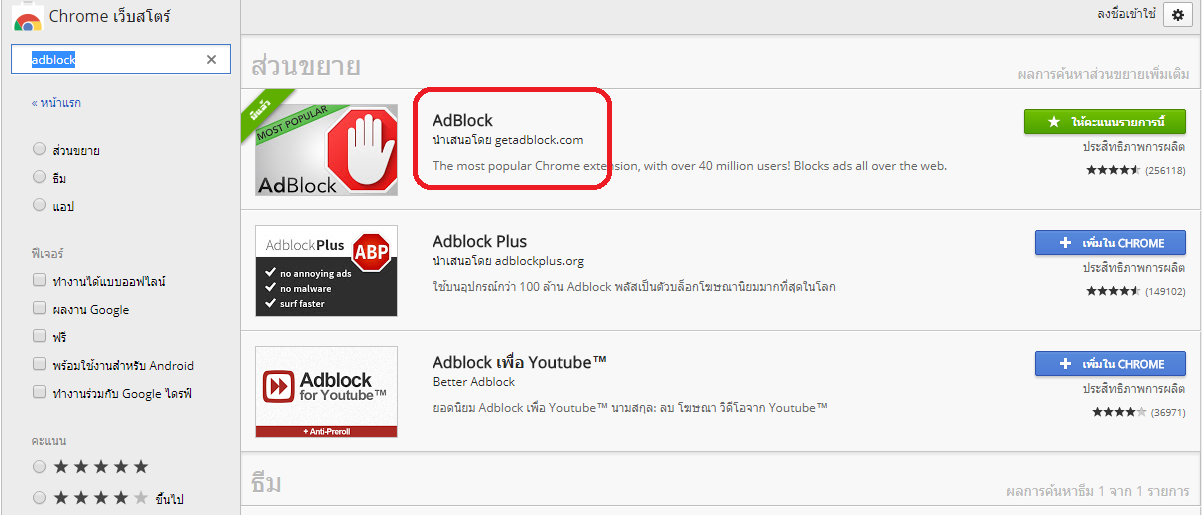 สามพิมพ์ในช่องค้นหาว่า adblock แล้วเลือกตามภาพ กดติดตั้งให้เรียบร้อย