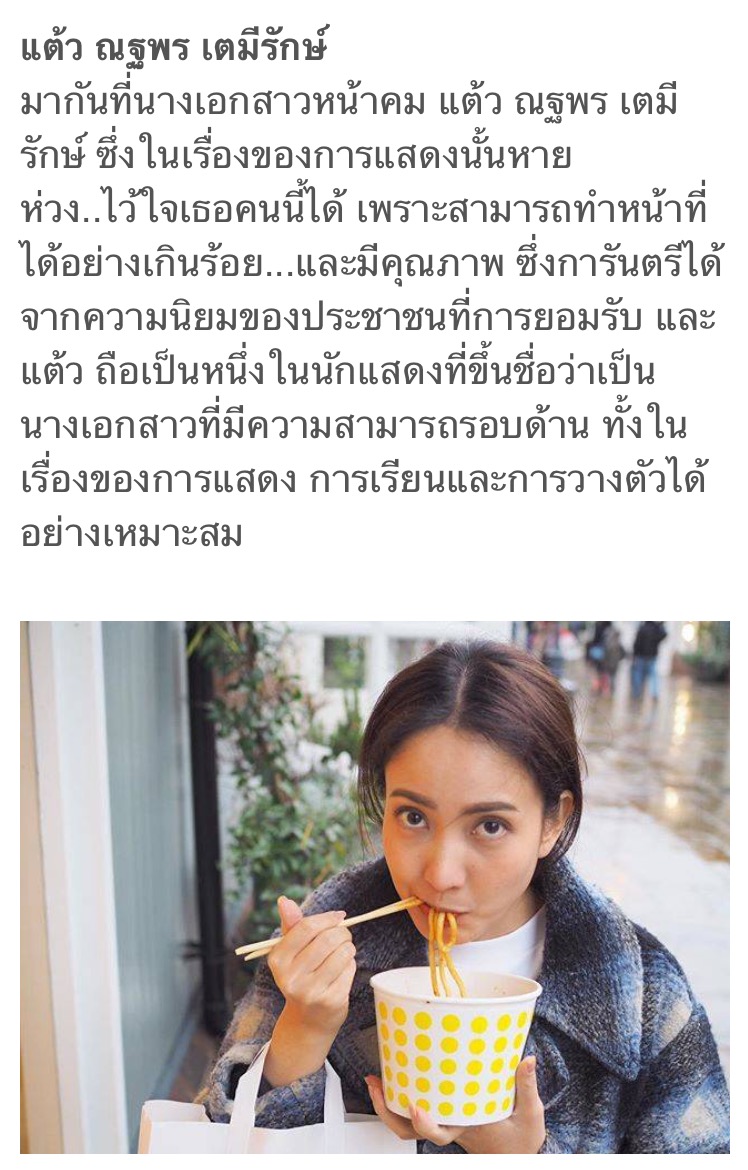 แต้ว ปลื้มคนยกนางเอกตลอดกาล บอกขอถ่อมตัวดีกว่า ไม่ซีเรียสคนเปรียบเทียบเล่นละครไม่ดีเท่ามิวนิษฐา บอกไม่น้อยใจ เผยยังไม่วางแพลนอนาคตร่วมกับต้น http://www.newsplus.co.th/47906 คลิปค่า