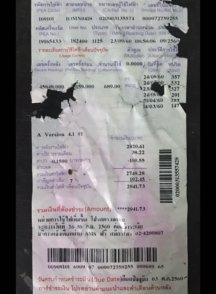 ขอรบกวนพื้นที่สอบถามครับ วันนี้ผมไม่อยู่บ้านไปทำงาน การไฟฟ้าได้ทำการมาจดหมายเลขแจ้งค่าไฟฟ้า แล้วกระดาษก็หล่นอยู่ที่หน้าบ้านฝนตกน้ำท่วมเละหมด แต่ที่น่าตกใจก็คือค่าไฟแพงขึ้นมาอีกเท่านึงโดยที่โหลดอุปกรณ์ที่ใช้ในบ้านยังคงเท่าเดิม ของผมเป็นบ้านเช่าสองชั้นปกติค่าไฟแต่ละเดือนจะอยู่ที่ 1300 ถึง 1500 บาทแต่เดือนนี้มาเกือบ 3000 บาทแบบนี้ต้องแจ้งหรือดำเนินการอย่างไรได้บ้างครับ