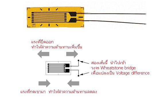 ตามภาพนี้ จะเห็นว่าความต้านทานจะเปลี่ยนไปได้เมื่อแผ่น strain gage ถูกแรงกระทำ