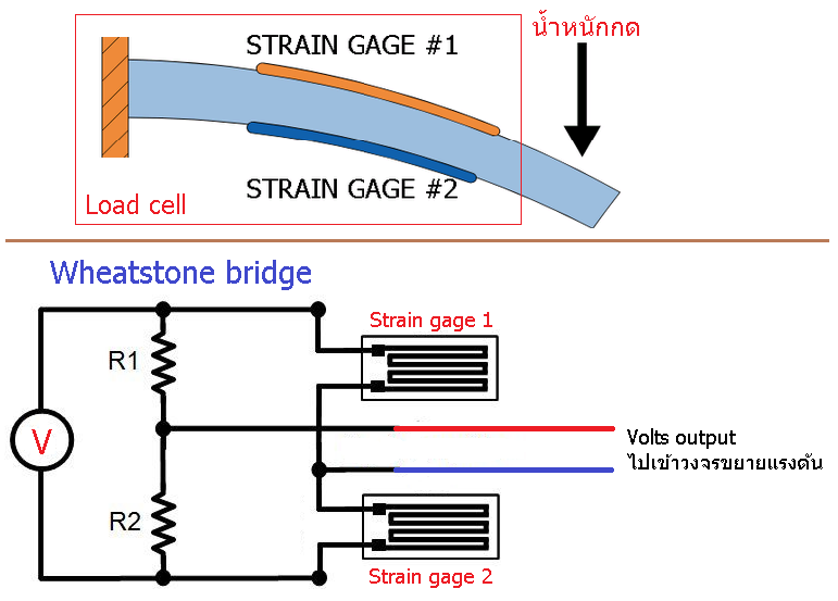 โดยแทนค่าตัว R ด้วย strain gage 2 ตัวครับ เมื่อ Load cell ถูกน้ำหนักกด strain gage 2 ตัว