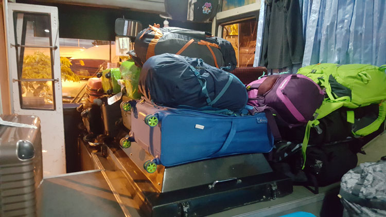 ขึ้นมาในรถแล้ว กระเป๋าเดินทางจะกองอยู่ที่หน้ารถคับ ตรงทางขึ้นลง...แล้วก็เดินไปหาที่นั่งได้เลยคับ