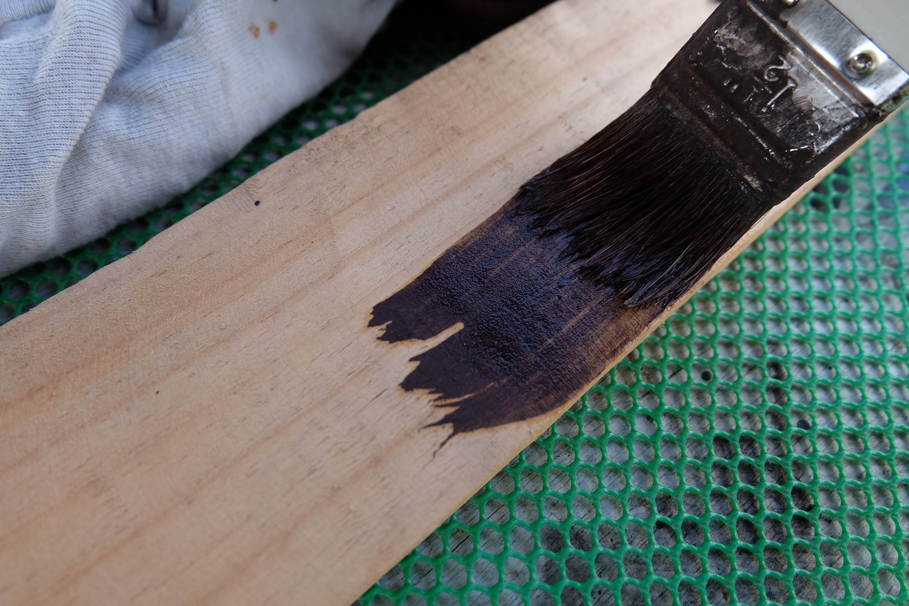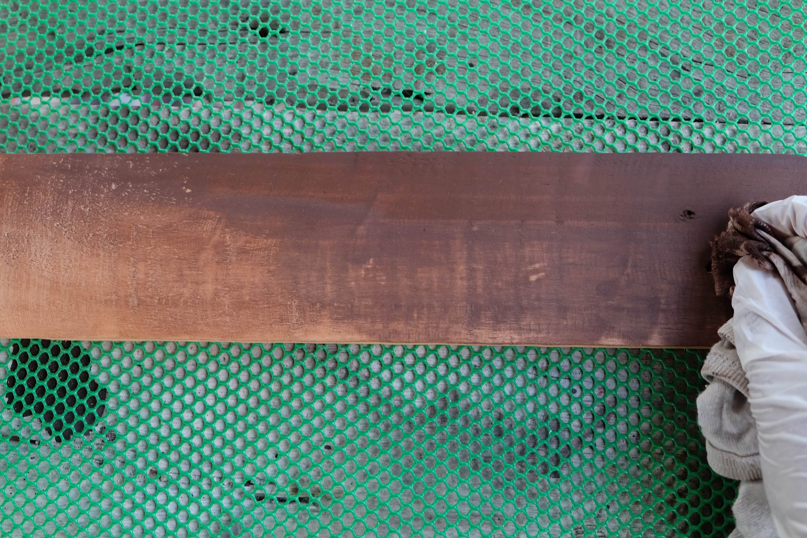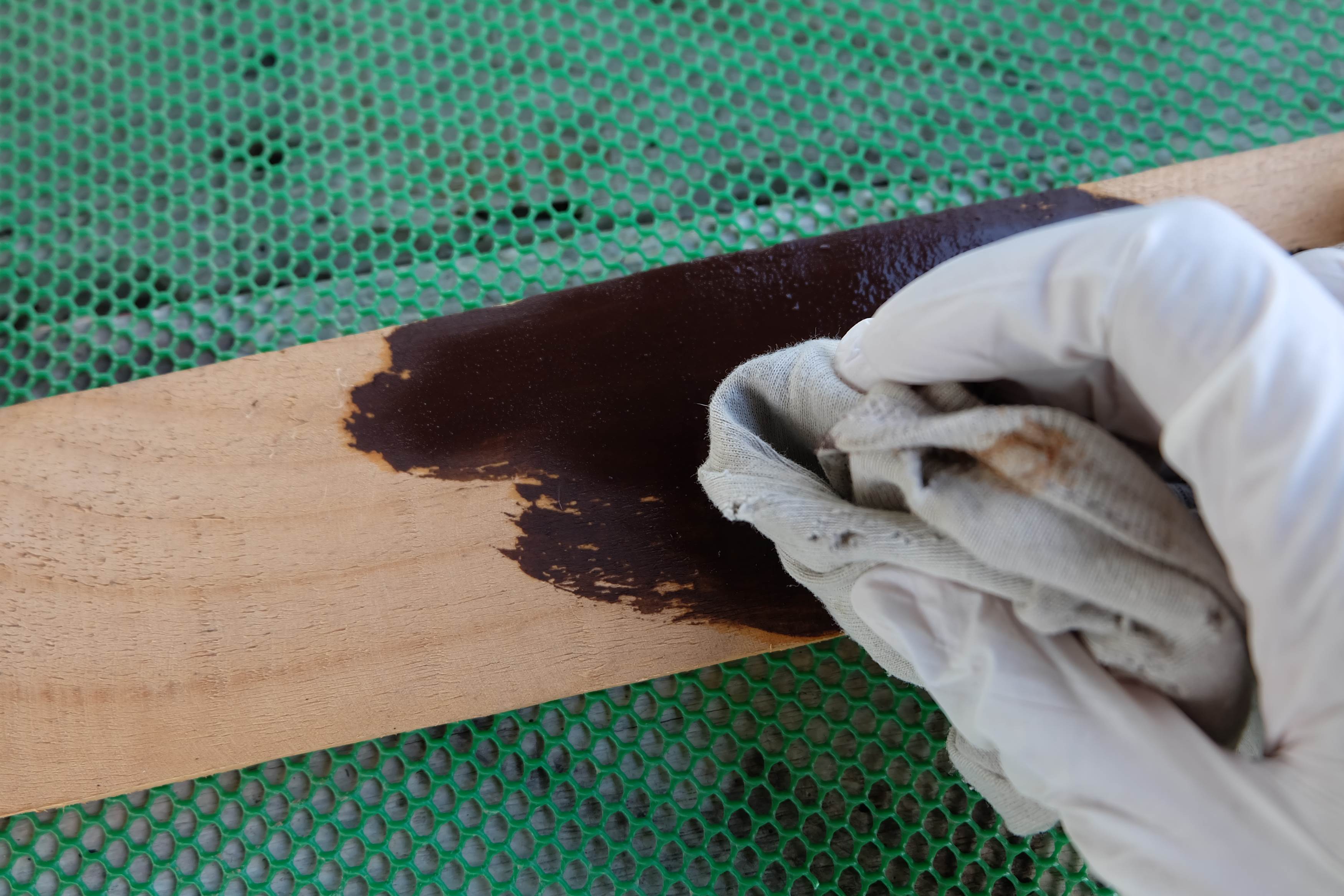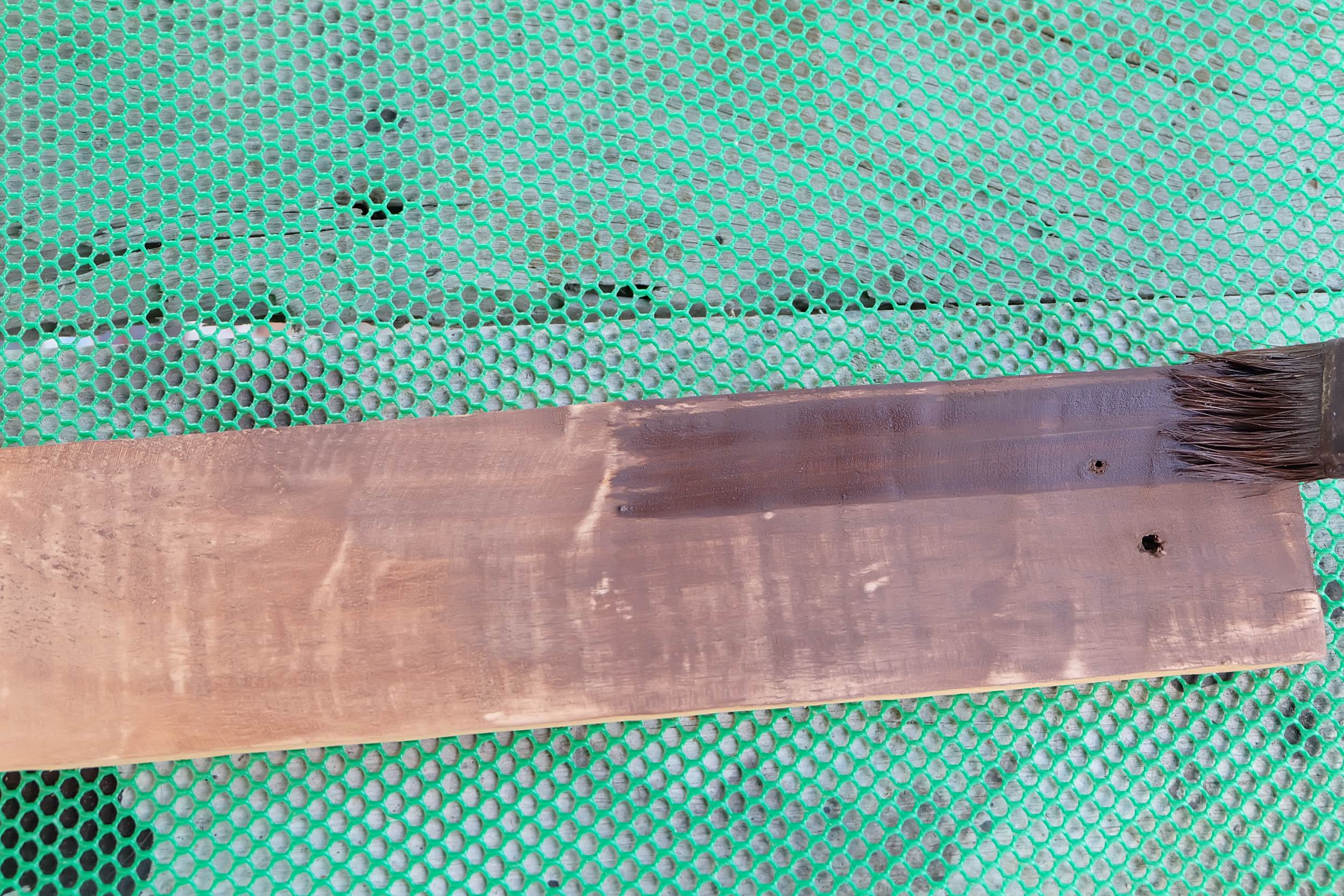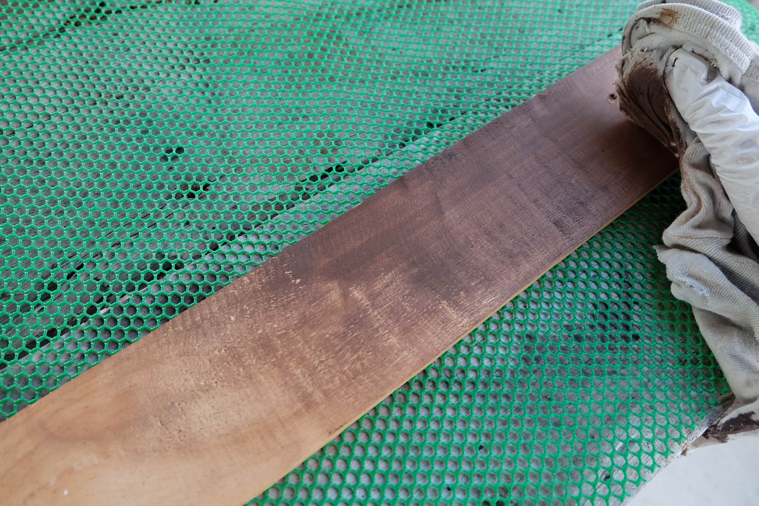 ใช้แปรงจุ่มสีที่ปลายแปลงนิดหน่อย ทาบนไม้ แล้วใช้ผ้าแห้งเช็ดทันที ขั้นตอนนี้เราถูแรงนิดนะคะ อยากให้เห็นลายไม้ด้วย